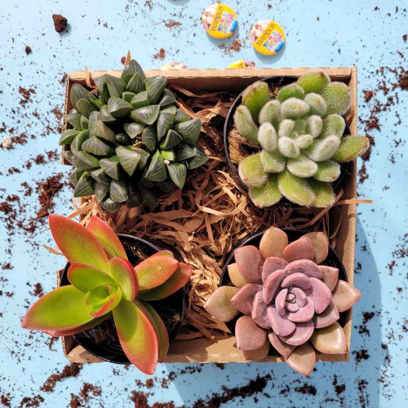 אריזת מתנה חגיגית הכוללת 4 סוקולנטים מסוגים וצבעים שונים (גודל 7)